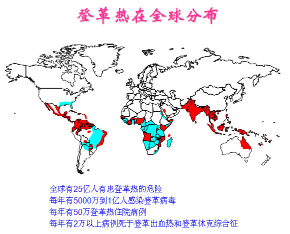 登革热流行于全球热带及亚热带地区,尤其是在东南亚、太平洋岛屿和加勒比海等100多个国家和地区。