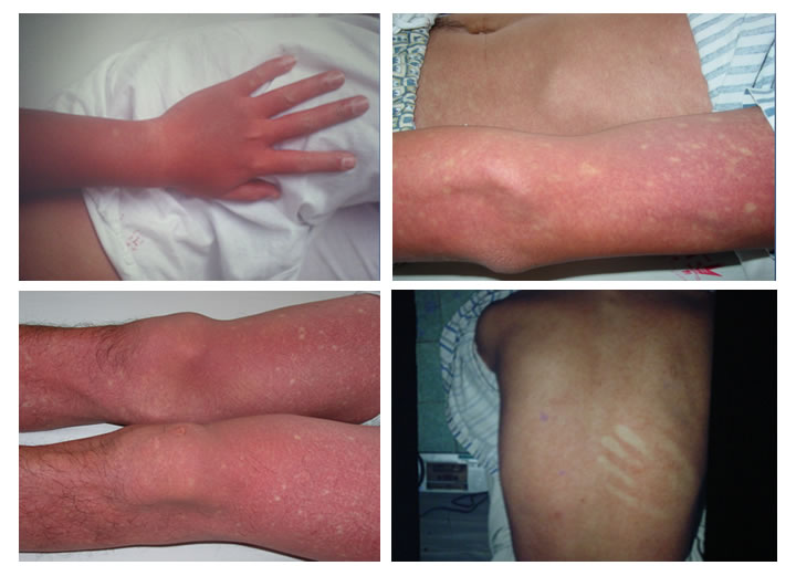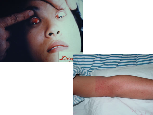 •急性发热期一般持续2~7天。于病程第3~6天在颜面四肢出现充血性皮疹或点状出血疹。典型皮疹为见于四肢的针尖样出血点及“皮岛”样表现等。可出现不同程度的出血现象,如皮下出血、注射部位瘀点瘀斑、牙龈出血、鼻衄及束臂试验阳性等。