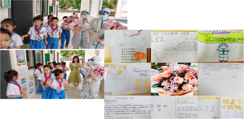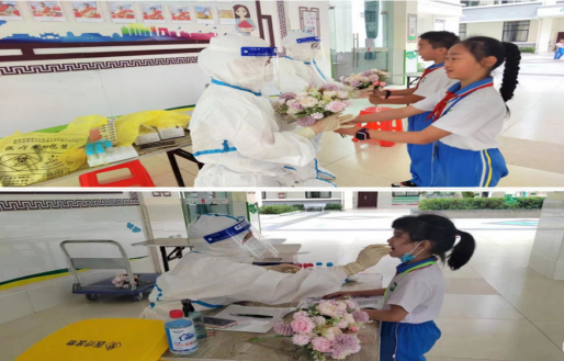 当3个小时过去,有一小学生跑到护士小白的身边,轻声问道:“姐姐,你们抓虫虫结束了吗?结束了,到我们班上,我们要给你表演节目”。核酸采集结束后,护士小白们立即被孩子们领到讲台,接过孩子们送的鲜花,心中是一股股的暖流……“小白姐姐,非常感谢你们,祝你们节日快乐!”大家齐刷刷举起手,敬少先队员礼,这时耳边响起了熟悉的音乐,同学们也跟随着跳了起来......