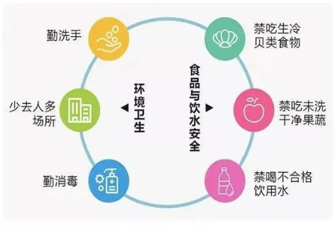 预防诺如病毒感染性腹泻的关键是把好“病从口入”这一关,要注意饮食和饮水卫生,养成良好的卫生习惯。(1)勤洗手;(2)少去人群密集场所;(3)勤消毒 ;(4)禁吃生冷贝类食物;(5)禁吃未洗干净果蔬;(6)禁喝不合格饮用水。