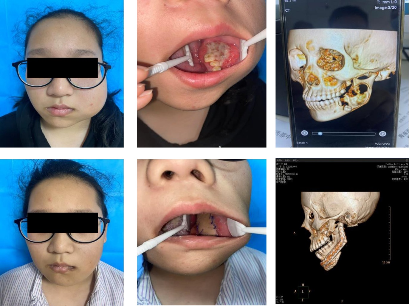 患者为一位13岁的小女孩,因左侧下颌骨成釉细胞瘤在海南某三甲医院先后接受了两次手术,但术后病情并未得到有效控制,肿瘤进一步发展,左面部肿大明显,严重影响患儿进食和外形。听闻海南西部中心医院为上海九院的医联体,患者将信将疑地来到了海南西部中心医院就诊,恰逢上海九院张志愿院士义诊,张院士为其面诊后,为患者制定了详细的治疗方案。