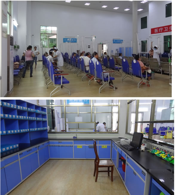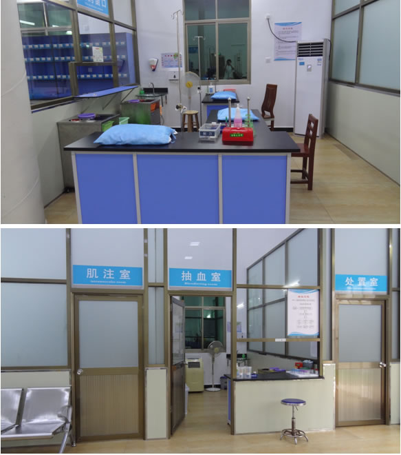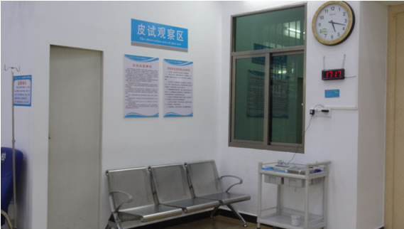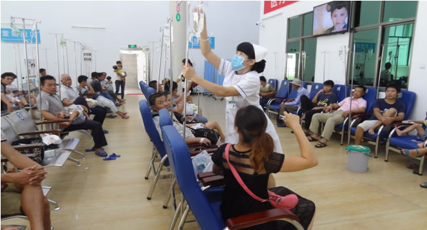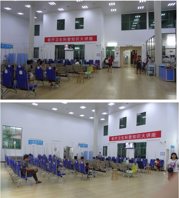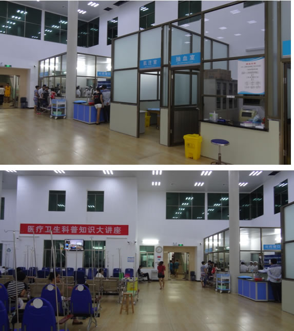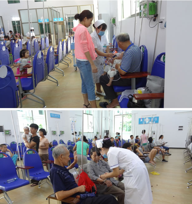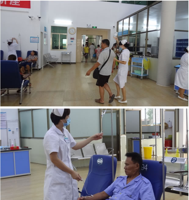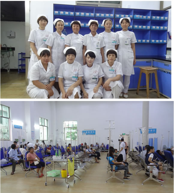 门诊注射室于2015年2月16日从门诊二楼搬迁到一楼新落成的输液大厅,总面积约 500平方米,左侧是配药室、输液室、肌注室、抽血室和处置室五个功能区,右侧是配有100张输液椅的输液大厅,分为成人输液区、儿童输液区和雾化治疗区三个区域。室内高度7米,大窗口自然采光和全方位灯光照明,配有52吋液晶大彩电,4台大功率空调。输液环境宽敞整洁、通风明亮、安全舒适。护理人员共12名,主管护师4名、护师5名、护士3名。