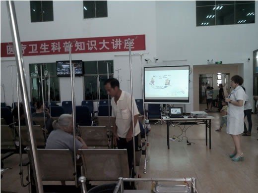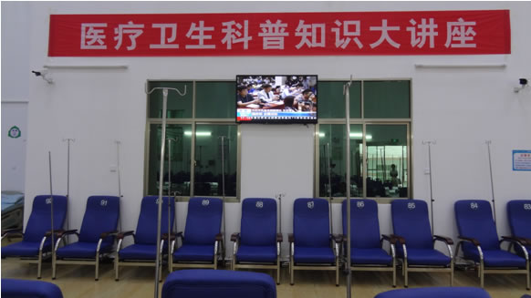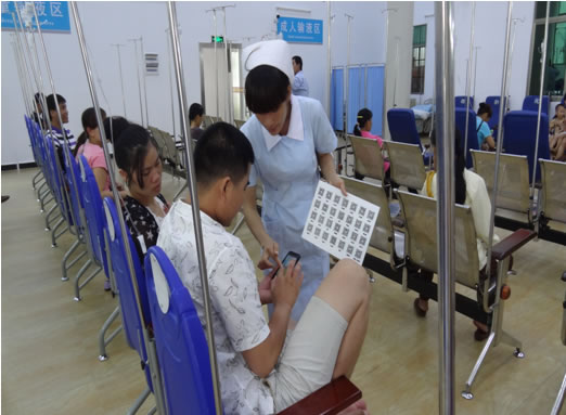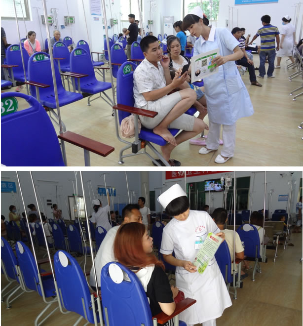 输液大厅的墙上粘贴各种温馨提示;护士在输液过程中,向患者介绍输液的注意事项,交代患者不可随意调节滴速和频繁活动穿刺的肢体,指导患者预防药液外渗、空气栓塞等。向患者宣教健康的生活方式,防病治病的知识,纠正有些家长不正确的观念:过度的忌口,认为孩子生病就不敢给孩子洗澡,孩子感冒了就一味地给孩子多穿衣服,把孩子裹得严严实实等做法。医院医教科在输液大厅每个月举办两次健康知识讲座,向患者传播各种常见病、多发病、传染病的预防保健知识。