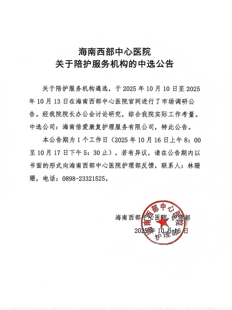 海南西部中心医院关于陪护服务机构的中选公告