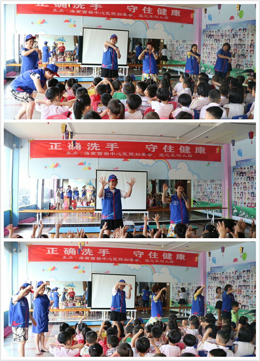 5月30日下午,炙热的高温烘烤着那大的大地,在中兴大街和信经典花园小区对面的“宝之乐幼儿园”,由海南西部中心医院妇委会组织,来自该院团委、院感办、宣传科等部门的9名志愿者积极参与的健康教育活动正在这里举行,也由此拉开海南西部中心医院志愿者协会夏季系列活动之二——走进宝之乐幼儿院活动的序幕,130多名幼儿园的小朋友们在这里第一次接受正规医疗机构人员为他们上了一堂生动活泼、别开生面的“正确洗手,守住健康”的主题教育课。