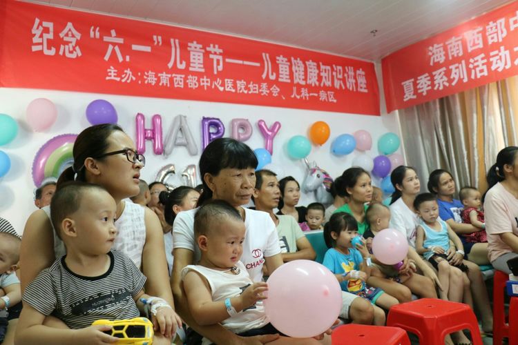 6月1日下午,在海南西部中心医院东院区(新区)住院大楼7楼一间临时点缀一新的会议室里,由海南西部中心医院妇委会、儿科一病区组织,该院志愿者积极参与的庆”六一”送健康知识讲座活动正在这里举行,40多名年轻的妈妈、爸爸带着自己的儿女正秩序井然、目不转睛地聆听着儿童健康专家的知识讲座。