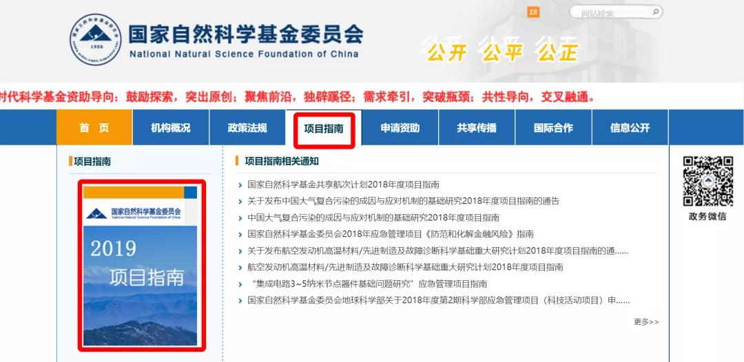 国家自然科学基金委员会2019年项目指南已正式发布!打开电脑端IE浏览器进入国家自然科学基金委员会主页,点击项目指南(红色框所示),在弹出页面中点击左侧2019年项目指南查看详细内容。